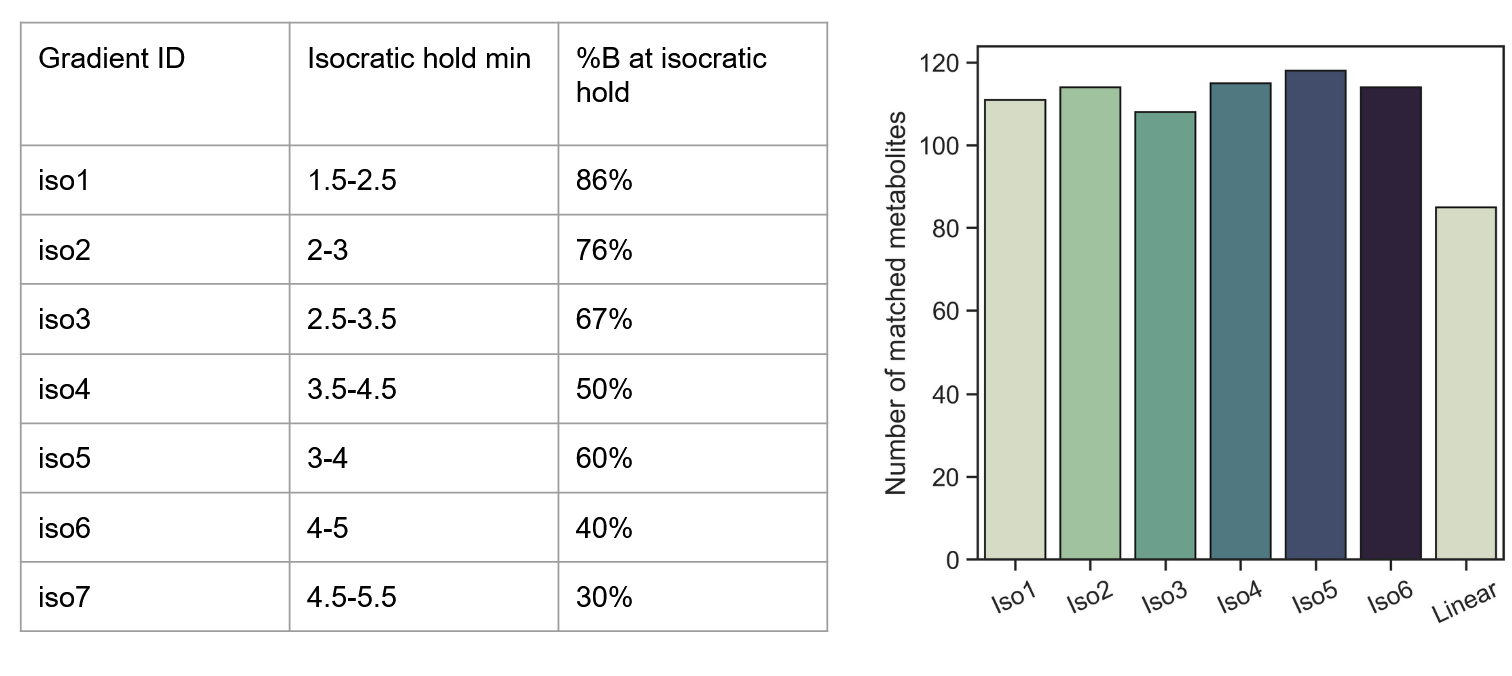 This approach was extremely promising—evening out every hotspot via a 1-minute isocratic hold increased the number of metabolites detected by ~30%! Presumably, this could be further improved upon by running combinations of isocratic holds.