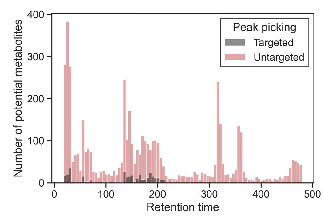 If you’re happy with the metabolite coverage observed for a column, you can move on to optimizing the start and end conditions as well as separation. Alternatively, instead of looking only at known metabolites, you can take advantage of untargeted peak-picking algorithms at this stage. Doing so essentially amplifies the effect you’d see when looking at targeted layouts with known metabolites. If you plotted it, it would look like this: