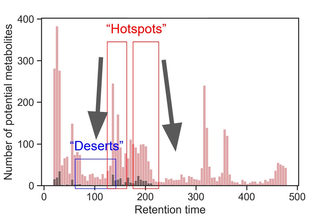 Using these layouts of known metabolites, pay attention to the retention times. At what time does the first “hotspot” occur? How about the last one? If you sufficiently covered the chemical diversity of the metabolome with these layouts, you’d be identifying the -omics equivalent of the first and the last peak.