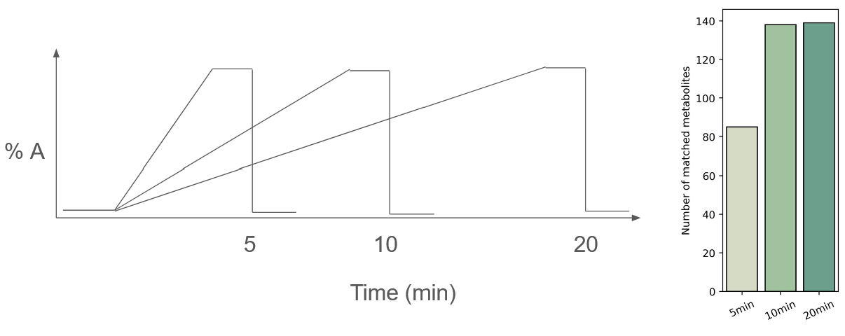 In the second approach, I tested the effect of gradient slope on the number of metabolites recovered. You might find the results surprising: I observed no improvement upon the starting condition (10 min run)! This is because the hotspots are the limiting factor for metabolite detection, and running a flatter slope effectively just moves these metabolite clusters around.