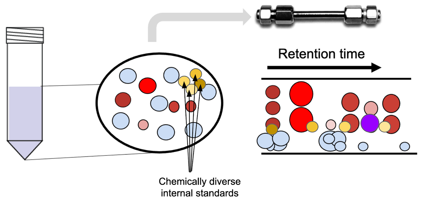 Generally speaking, an analyst can choose from two options for internal standards: chemically matched and chemically non-matched. It’s no secret bioanalysts love chemically matched internal standards; NAD for NAD, citrate for citrate, and so on. So far, we assumed that the internal standard was chemically matched to the analyte of interest (the purple and light purple circles in Figure 2). The reason for the preference for chemically matched internal standards is that the isotopically labeled standard behaves chromatographically exactly like your metabolite of interest. Any differences in microenvironments will propagate to the internal standard, as do any degradation of the metabolite.