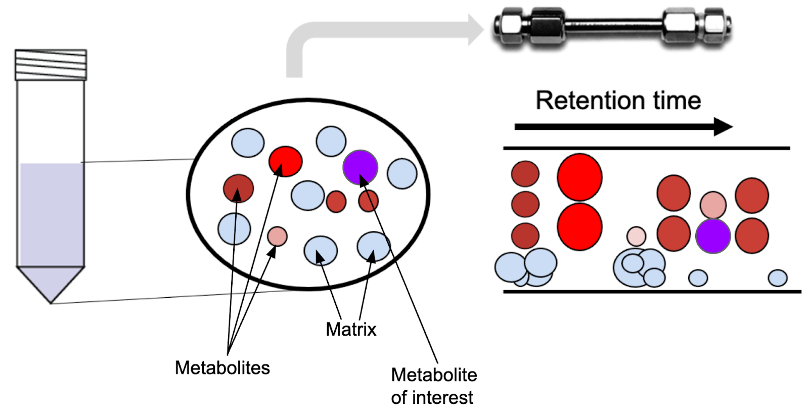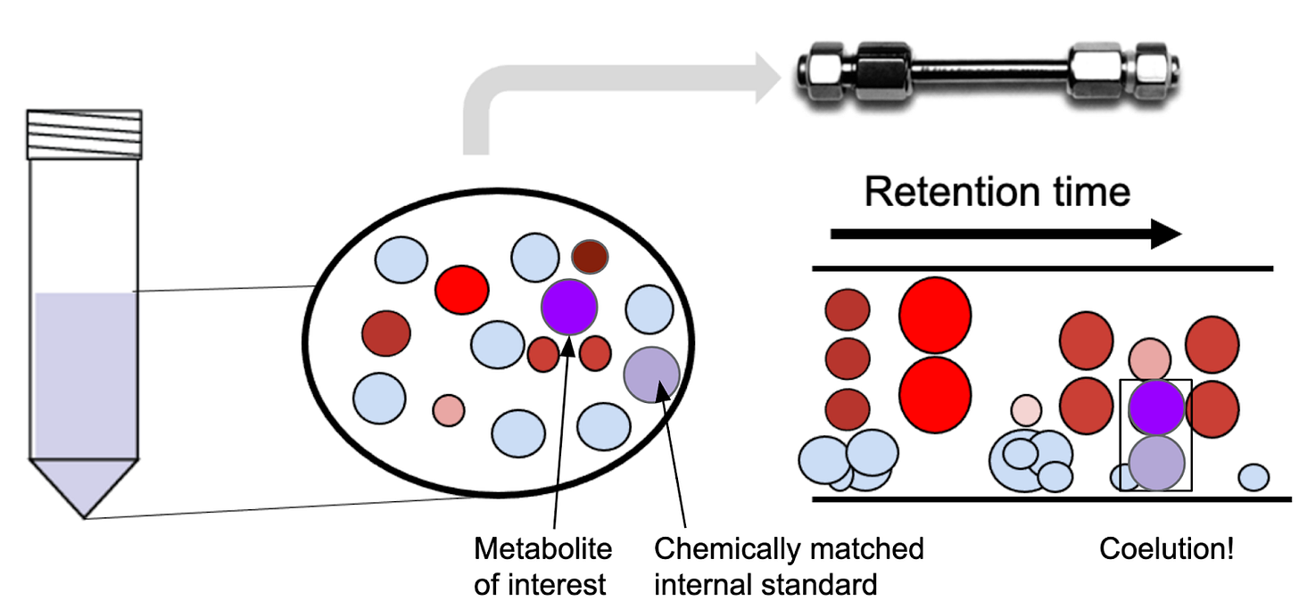At each time point over the chromatographic separation, only the molecules that co-elute (elute together) are transferred into the mass spectrometer. The LC separation leads to essentially the generation of microenvironments within the run. Since each metabolite experiences a slightly different chemical microenvironment depending on what it co-elutes with, the signal measured in the mass spectrometer might be lower than it would without the matrix components. Internal standard helps correct for that, because it is added to the sample in known concentration (or alternatively, in the same concentration between samples - I’ll discuss how to take advantage of this below).
